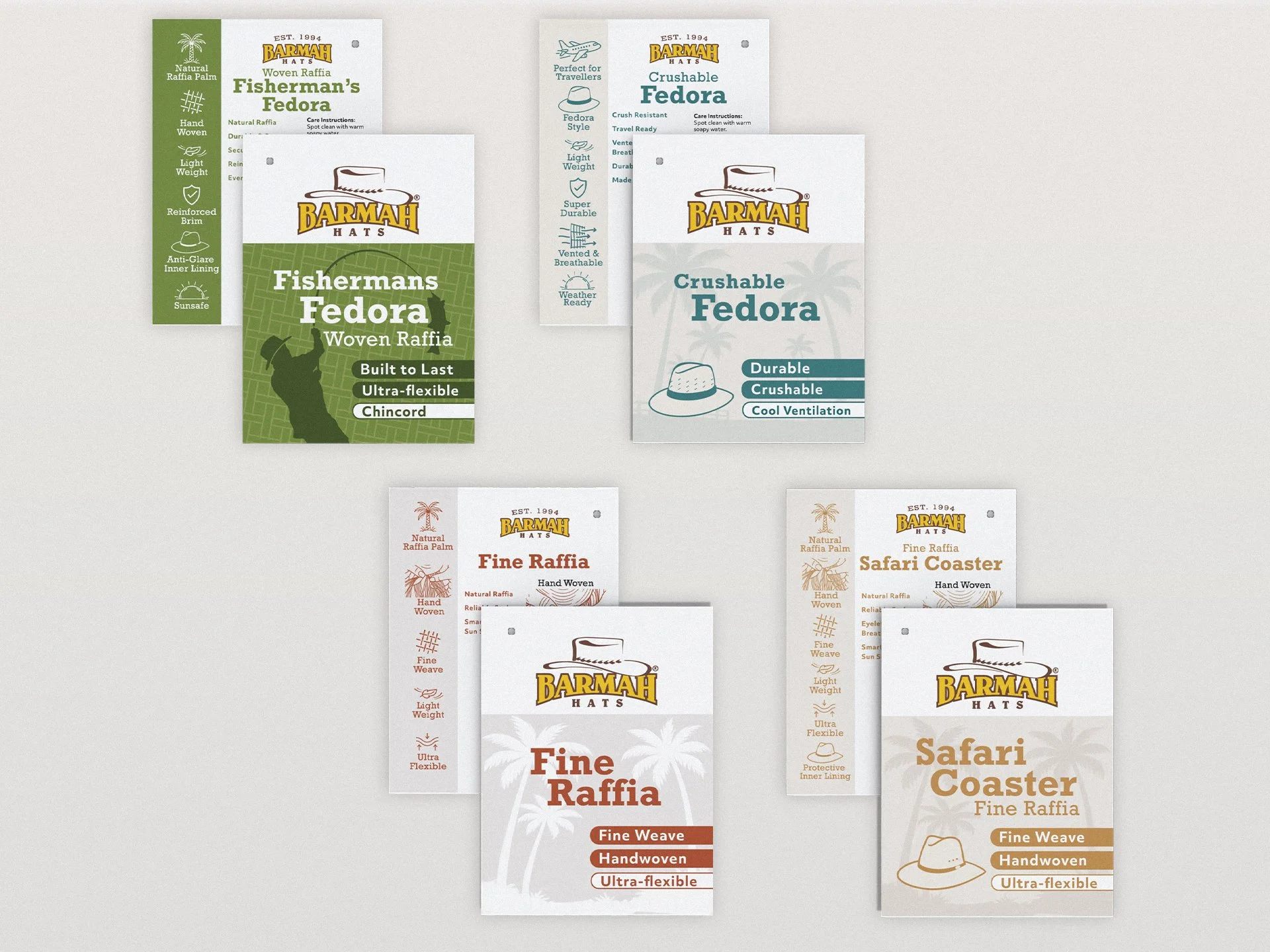 Each tag uses a shared visual framework (icons, typography and layout) while colour, illustration and feature highlights change to suit the individual hat style. This keeps the range unified but still gives every product its own distinct presence on the rack.